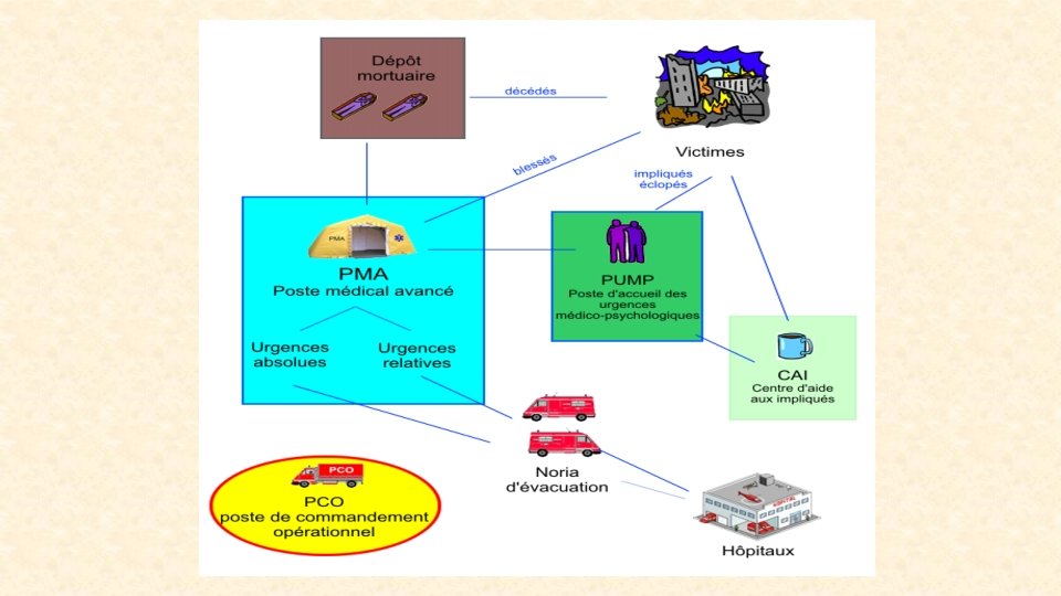 Le plan blanc et plan blanc élargi • Spécifique et obligatoire pour chaque établissement de santé public ou privé. • Les motifs de déclenchement: • Afflux brutal de nombreuses victimes • Crise sanitaire exceptionnelle • Crise interne grave