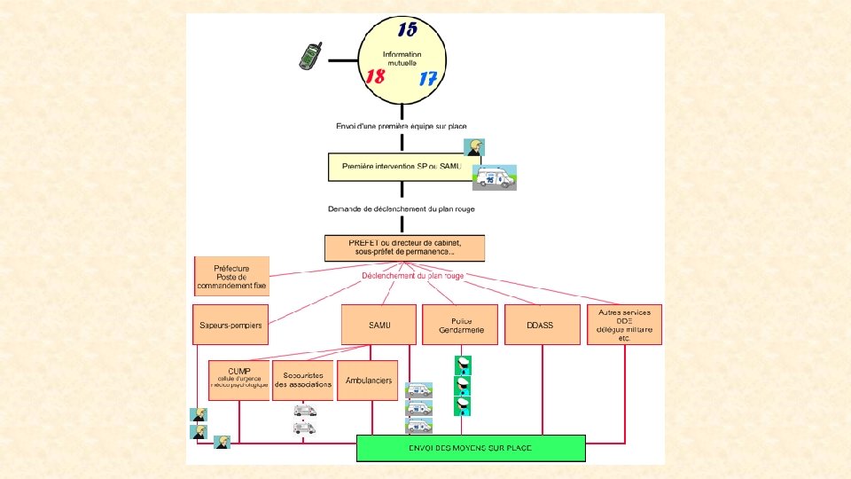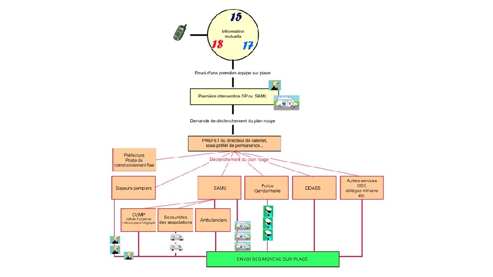 • Cette cellule peut décider : – Le maintien sur place ou le rappel de personnels médicaux, techniques, administratifs ; – La libération de lits d’hospitalisation par déplacement de malades, ouverture de structure de réserve, arrêt ou report des activités programmées. – La mobilisation de moyens matériels de réserve (lots PSM, dotation NRBCE) ; – La mise en place d’un plan d’accueil des urgences spécifique, selon la nature de l’événement (NRBCE) ; – L’établissement d’un plan de circulation et de stationnement particulier dans l’hôpital.