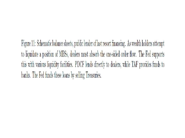 Figure explanation • As wealth holders attempt to get rid of their MBS the dealers must buy them. The Fed supports them with various facilities. PDCF provides funds to dealers while TAF provides fund to banks. The Fed finances these loans by selling treasuries.