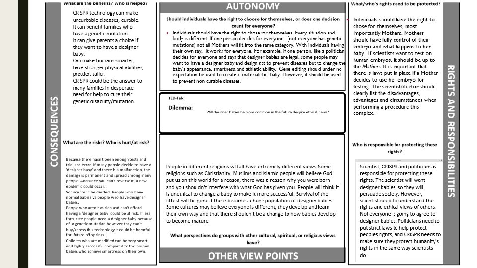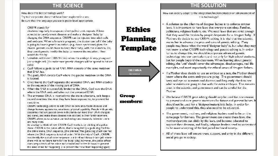 Our solution: ■ A solution to the dilemma of designer babies is to enforce stricter laws. It is important to have laws that everyone can obey. Families, politicians, religious leaders, etc. We need laws that are strict enough that they won’t be broken by people desperate for a designer baby. If Mothers do decide to use CRISPR editing, it is vital that the scientist warns her in advance the pros and cons of genetic editing. Many people may know what the word ‘designer baby’ is, but what they may not know is what CRISPR technology and genetic editing is. In order for us to change this, we should incorporate advanced genetic technology into our curriculum; and not only for high school students, but for people beyond the classroom. When learning about genetic editing, the ‘unit’ should cover the advantages, disadvantages, real life examples, and most importantly the ethical views of designer babies. ■ If a Mother does decide to use an embryo as a test, the Mother should know where the extra embryos are going. The government should keep and eye on scientists and doctors and frequently check to see what scientists are going to due with the extra embryos. This ensures trust in the scientist and government and can be a relief for the Mother. ■ We believe CRISPR gene editing should only be used for one reason: to prevent and cure genetic mutations for future and present babies. It should not be used for a ‘designer/materialistic baby. In order for people to understand this, they also need to be educated. ■ The government, mothers, and religious leaders need to be on the same page for fairness. The government can create these laws, the mothers/parents can abide by the laws, and become educated to support their decision, and finally, religious leaders need to understand to be more accepting of the fast paced technical society. ■ All of these laws will ensure trust, support, and unity in the different social groups of society.