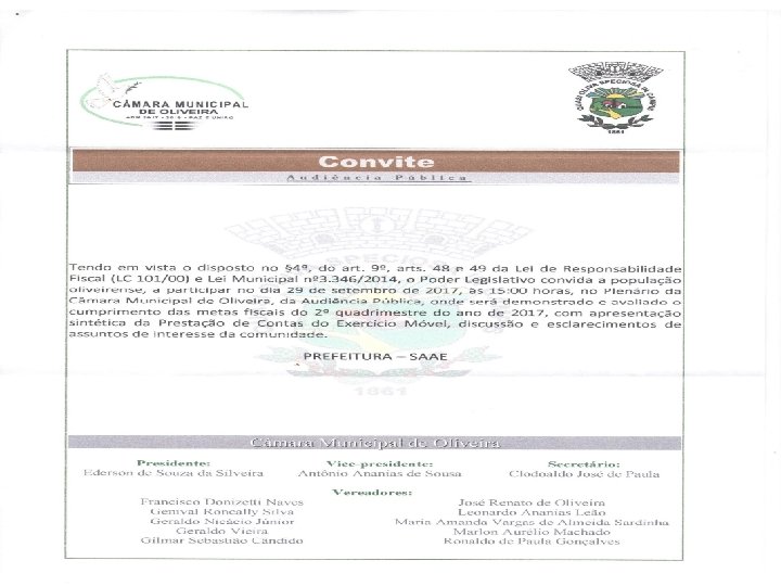 AUDIÊNCIA PÚBLICA “ 2º QUADRIMESTRE DE 2017” OBJETIVO: DEMONSTRAR E AVALIAR O CUMPRIMENTO DAS METAS FISCAIS DO QUADRIMESTRE. Fundamentação Legal: • § 4º Art. 9º, Art. 48 e 49 da Lei de Responsabilidade Fiscal (LC 101/2000). • Lei Municipal nº 3. 346/2014.