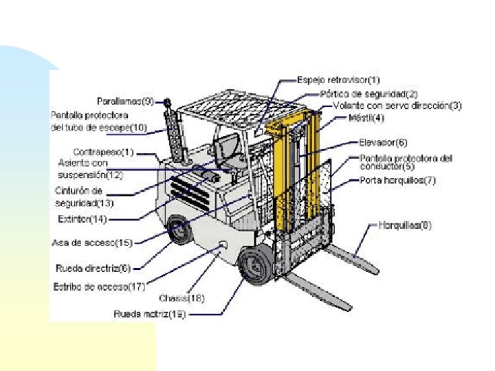 COMPONENTES DE SEGURIDAD Y ERGONOMIA Pórtico de seguridad n. Placa portahorquillas n. Asiento amortiguador y ergonómico n. Protector tubo de escape n. Silenciador con apagachispas y purificador de gases n. Paro de seguridad de emergencia n. Placa de identificación n. Freno de inmovilización n. Avisador acústico y señalización luminosa de marcha atrás n