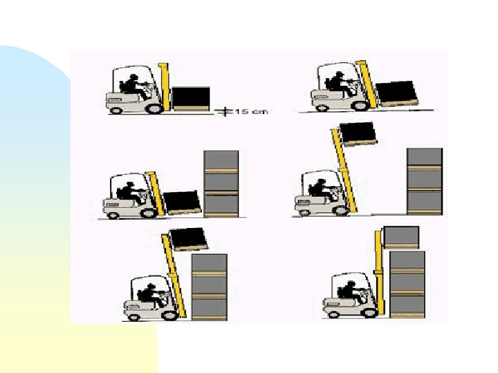 MANIPULACIÓN DE CARGAS Se han de seguir los siguientes criterios: n Recoger la carga y elevarla unos 15 cm sobre el suelo. n Circular llevando el mástil inclinado el máximo hacia atrás. n Situar la carretilla frente al lugar previsto y en exposición precisa para depositar la carga. n Elevar la carga hasta la altura necesaria manteniendo la carretilla frenada. n Avanzar la carretilla hasta que la carga se encuentre sobre el lugar de descarga. n Situar las horquillas en posición horizontal y depositar la carga, separándose luego lentamente. n La circulación sin carga se deberá hacer con las horquillas bajadas.