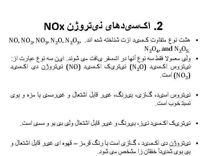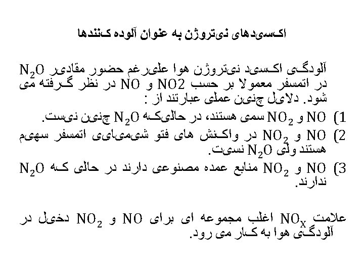 • Sulfur oxides can damage trees. • Sulfurous pollutants can discolor paint, corrode metals, and cause organic fibers to weaken. • Airborne Sulfates reduce visibility and discolor the atmosphere. • Prolong exposure to Sulfates cause serious damage to building marble, limestone and mortar, as the carbonates (e. g. limestone, Ca. CO 3) in these materials are replaced by sulfates. • Ca. CO 3 +H 2 SO 4 → Ca. SO 4 + CO 2 + H 2 O.