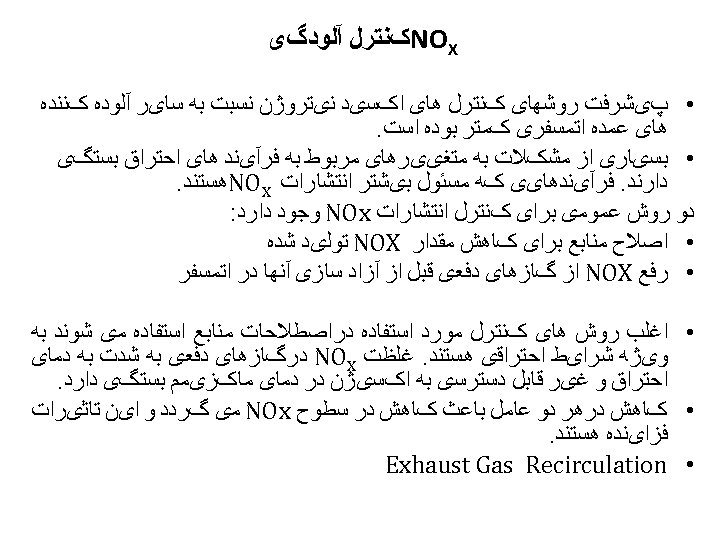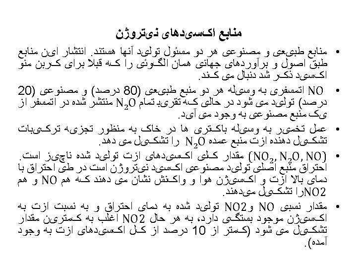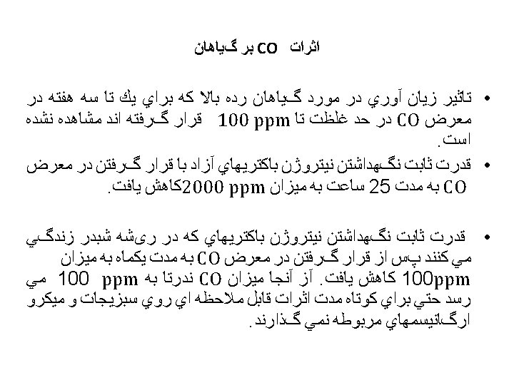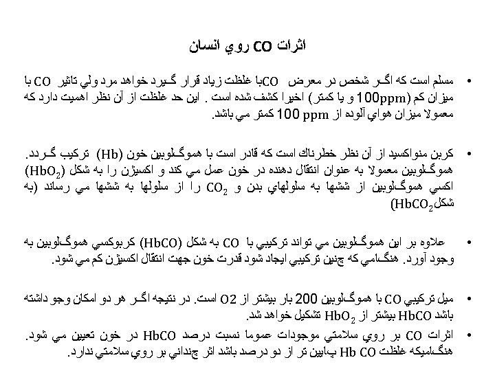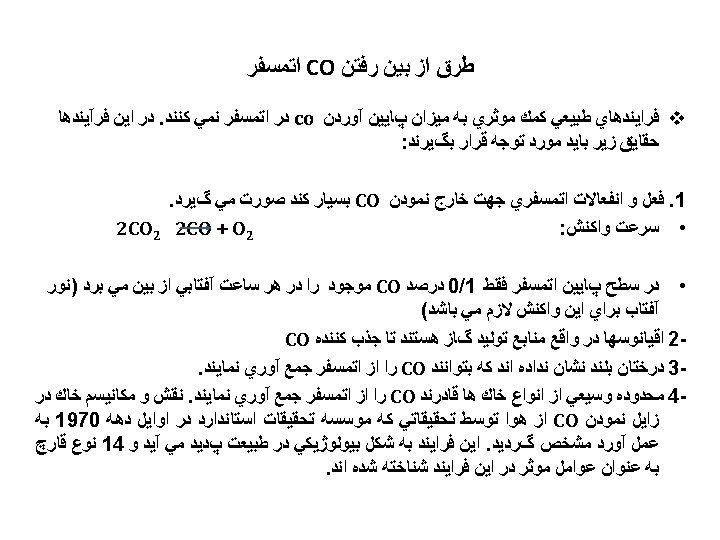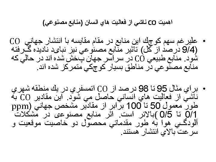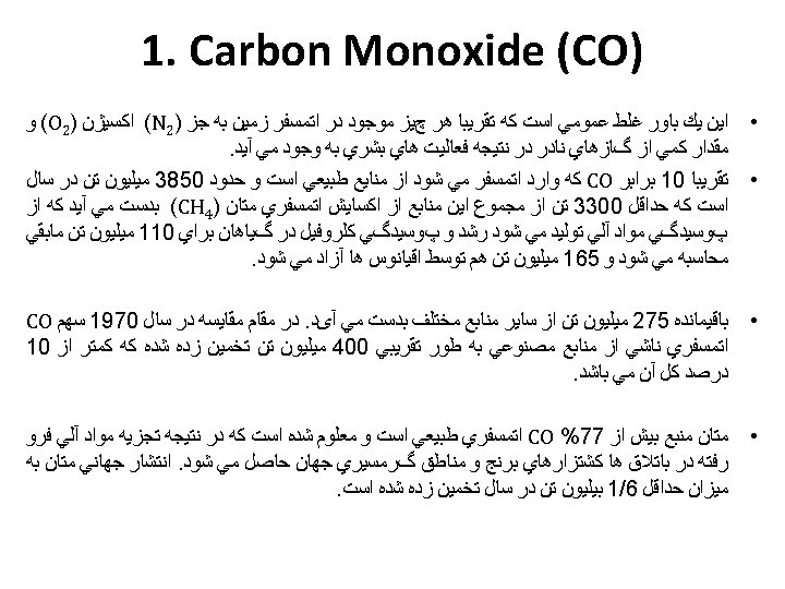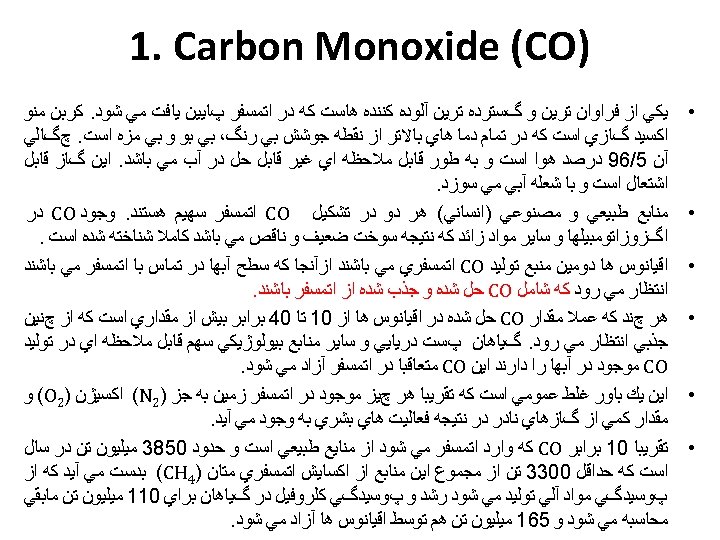 • It is produced when carbonaceous fuels are burned under less than ideal conditions. • 77% of total CO emissions are from transportation sector. • All CO in urban areas comes from motor vehicles. • Incomplete combustion (yielding CO instead of CO 2) results when any of the following four variables are not kept sufficiently high: Ø Oxygen supply Ø Combustion temperature Ø Gas residence time at high temperature Ø Combustion Chamber Turbulence