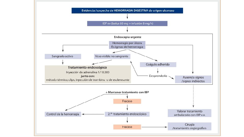 Gravedad de la HDA según los hallazgos endoscópicos Alto riesgo de recidiva o persistencia > 10% Hemorragia activa pulsátil Hemorragia activa por rezumamiento Vaso visible en la base de la úlcera Coágulo reciente Coágulo adherido a la base de la úlcera Úlceras de gran tamaño Úlceras localizadas en cara posterior de bulbo duodenal o en parte superior de curvatura menor gástrica Restos hemáticos en la base de la úlcera Úlcera con base limpia Lesiones agudas de la mucosa gástrica Duodenitis sin sangrado activo Hemorragia por hernia de hiato Síndrome de Mallory-Weiss Esofagitis Bajo riesgo de recidiva o persistencia < 10%