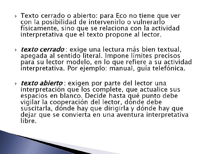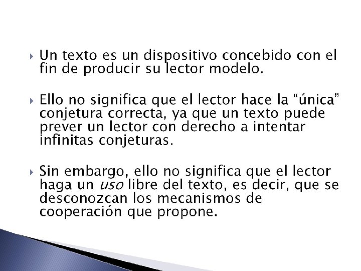 � ENCICLOPEDIA: convenciones culturales que ha producido la lengua, y la historia de las interpretaciones previas de muchos textos, incluyendo el texto que el lector está leyendo. � Serie de pasos cooperativos que se realizan para actualizar las intenciones que el enunciado contiene virtualmente, de acuerdo a la competencia enciclopédica:
