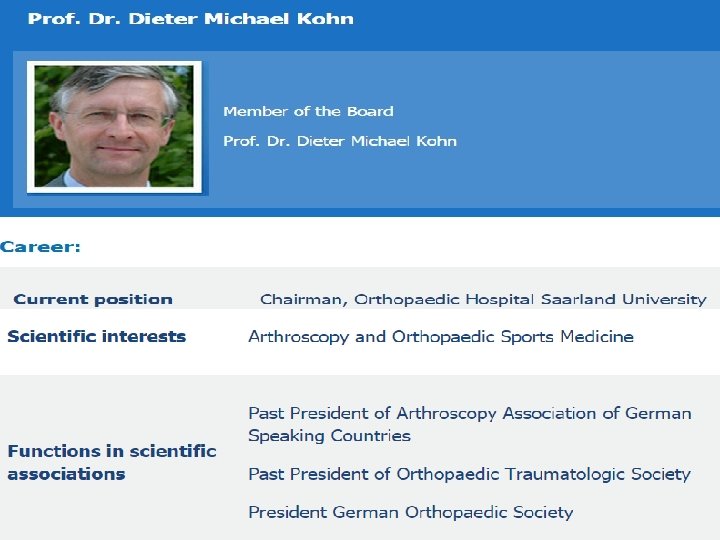 Outcome analysis • The evaluation of the outcome was conducted using a special questionnaire regarding pain (strong pain, moderate pain, sometimes pain and no pain), overall satisfaction (very satisfied = 1, satisfied = 2, partially satisfied = 3, not satisfied = 4), repetition of surgery (‘I would undergo the surgery again’, ‘I reluctantly agree to undergo the surgery again’, ‘No I would never undergo the surgery again’) • To evaluate the functional outcome of the surgery, the Lysholm score and the Visual Analogue Scale as well as the range of motion were used preoperatively and at present.