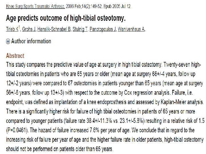 • Trieb et al. reported in their study that the failure rate after high tibial osteotomy was significantly higher in patients over 65 years compared to the younger patients. • Gstottner et al. had concluded that the survival rates of patients below 50 years were higher compared to those over 65 years. •