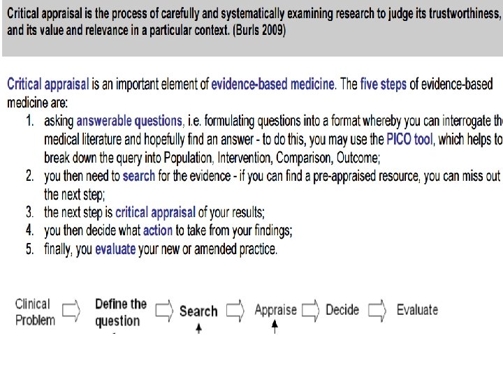 • Critical appraisal 1 -Evaluate of the study design 2 -Assess the methodology 3 -suitability of the statistical methods 4 -Relevance of the research to one's own practice