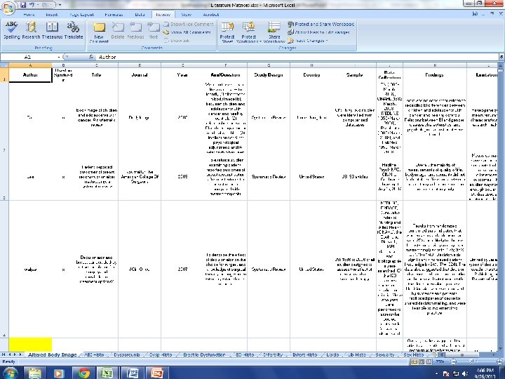 Put it Together in One Place Excel! One article per row Allows for sorting by: Date Author Level of evidence Etc. See the big picture Identify common themes