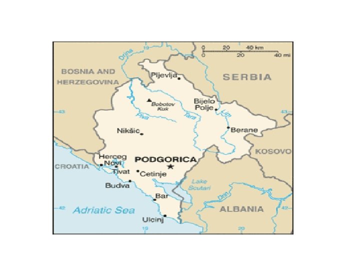 UKRATKO Glavni grad: Podgorica Ima izlaz na Jadransko more Valuta je euro Službeni jezik je crnogorski Graniči sa Srbijom, Kosovom, Bi. H, Albanijom i Hrvatskom • Najduža rijeka je Zeta • Najveće jezero je Skadarsko jezero • • •