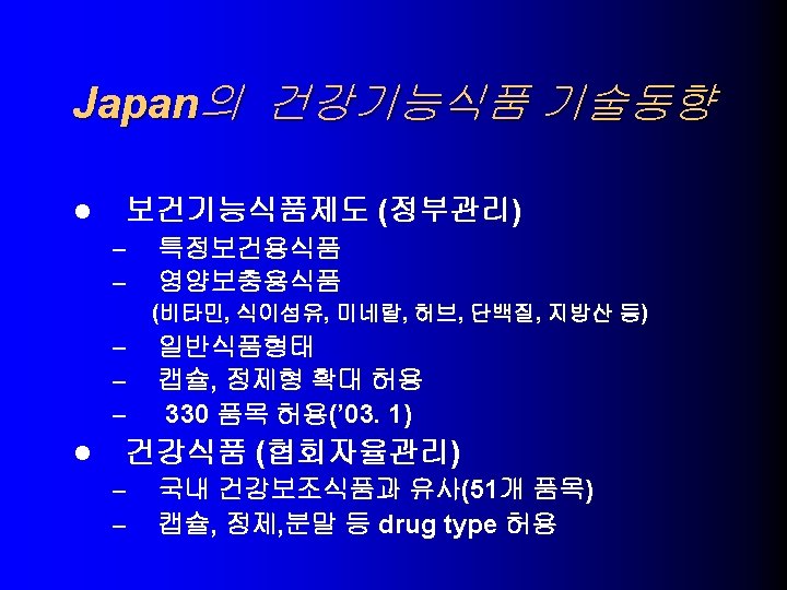 Japan의 건강기능식품 기술동향 l 특정보건용식품 – (7개 기능, 13개 표시 허용) 1. 장의 상태를 조절 (fiber, oligosacharide, lactobacillus) 2. 콜레스테롤 조절 (peptide, dietary fiber, protein) 3. 혈압조절 4. 미네랄흡수개선(CPP, CCM, Heme Fe, peptide) 5. 충치관련 6. 중성지방관련 (indigestible dextrin) 7. 혈당조절 (soy protein, soluble dietary fiber, peptide) (peptide, glycoside) (sugar alcohol, polyphenol)