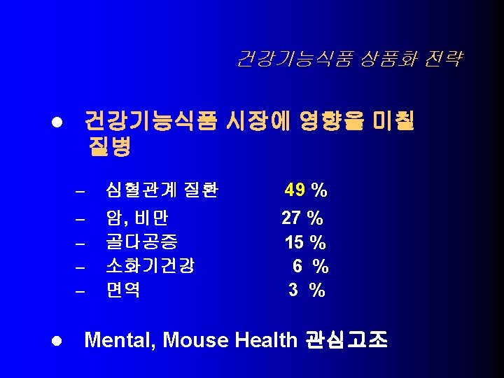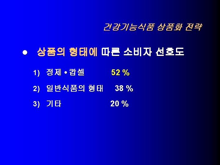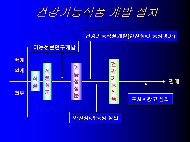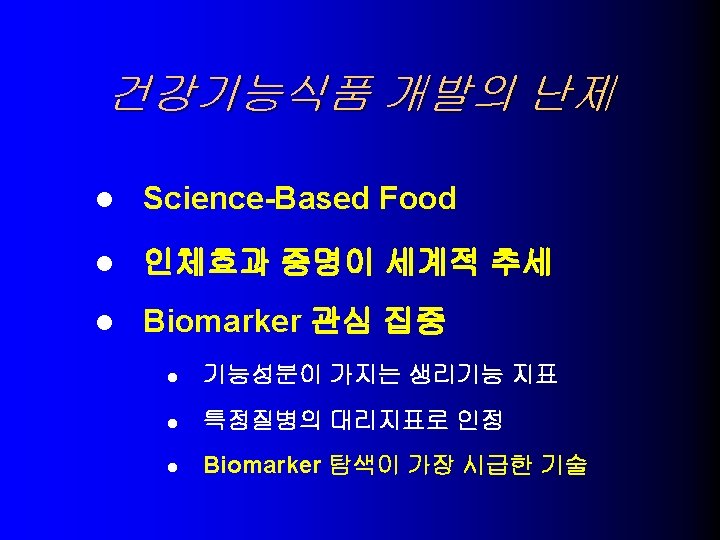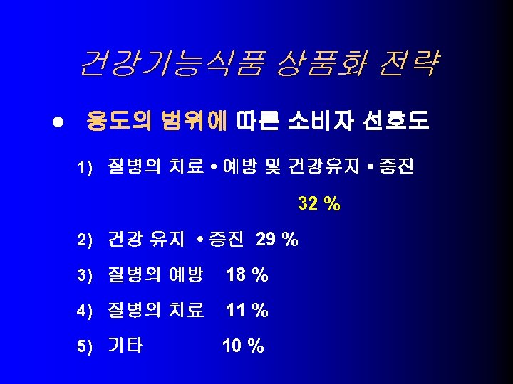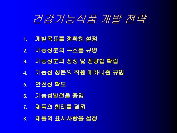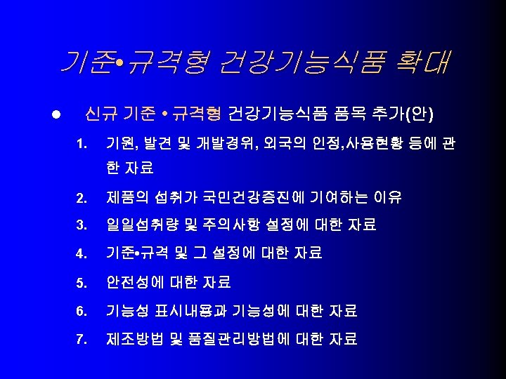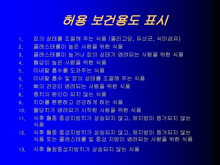 USA의 건강기능식품 기술동향 당 알콜과 충치 9. – – 귀리의 수용성섬유소와 관상동맥 심질환 10. – – > 0. 75 g oat soluble fiber per serving, Low fat, Low choleste. Oatmeal cookies, muffins, brealds, cereals, dietary supplem. 대두단백과 심장관상동맥 심질환 11. – > 6. 25 g soy protein, Low fat, Low cholesterol, Low saturated fat 식물성 스테롤 및 스타놀 에스테르와 심장관상동맥 심질환 12. l xylitol, sorbitol, erythritol, mannitol, > p. H 5. 7 Sugarless candy and gum – > 0. 65 g plant sterol ester, > 1. 7 g plant stanol ester – Salad dressing, snack bars, dietary supplement Significant scientific agreement 평가로 허용