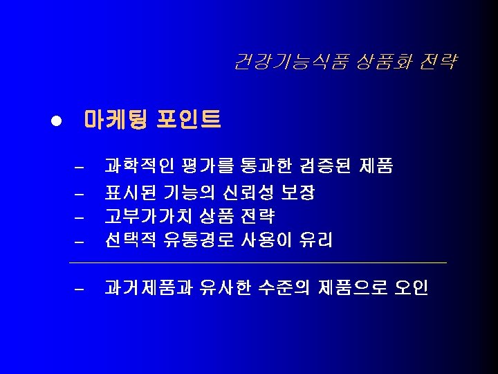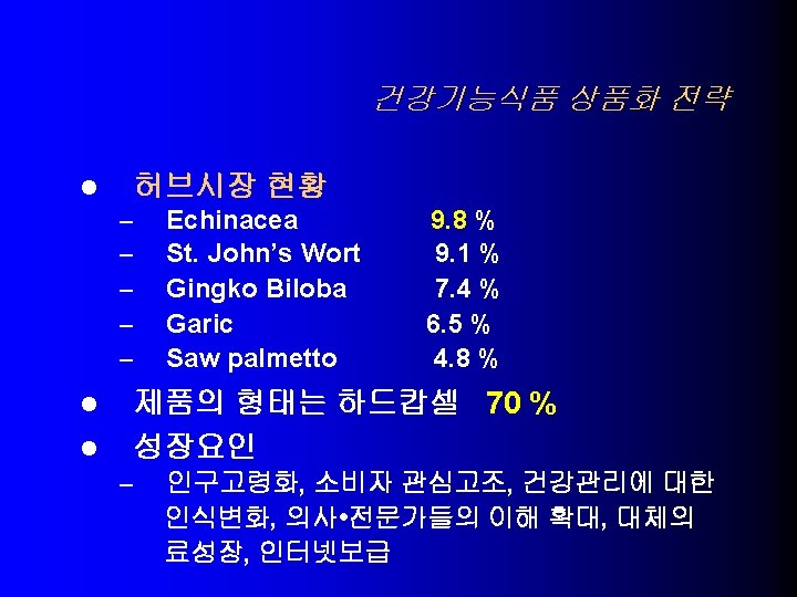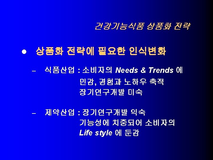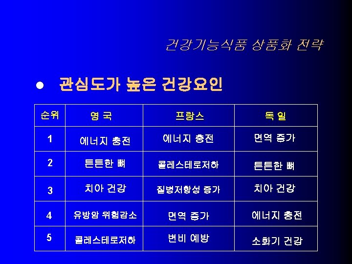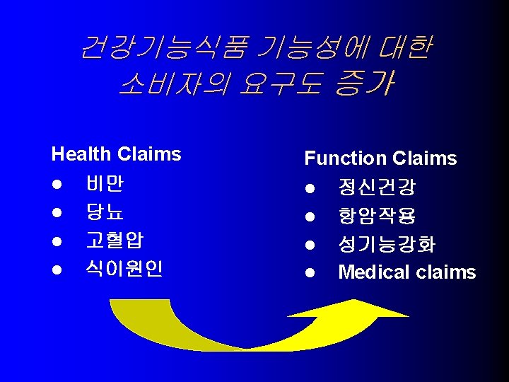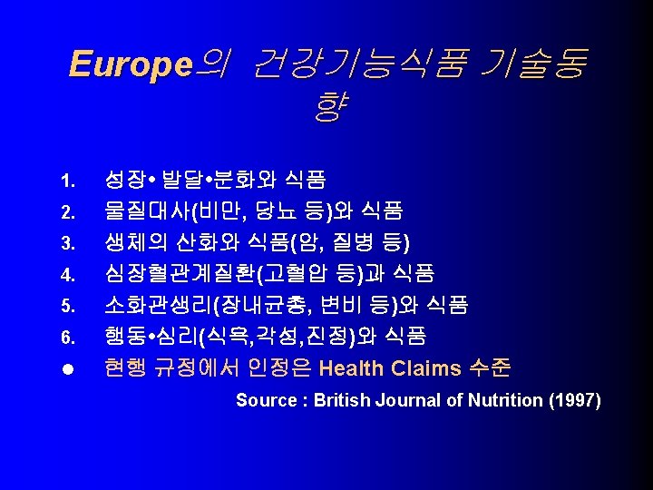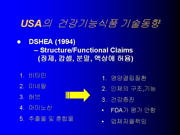 USA의 건강기능식품 기술동향 l NLEA (1990) – Health Claims (일반식품에 허용) 1. 칼슘과 골다공증 – – high calcium , Low-fat milk, yogurt, tofu, calcium-fortified citrus drinks calcium supplements 나트륨과 고혈압 2. – – Low Sodium Unsalted tuna, salmon, fruits and vegetables, low-fat milk, cereal 식이지방과 암 3. - Low Fat Fruits, vegetables, reduced-fat milk products, cereals, flours 포화지방 및 콜레스테롤과 관상동맥심질환 4. – – Low saturated fat, Low cholesterol, Low fat Fruits, vegetables, skim and low-fat milks, cereals, pastas(not egg pastas)