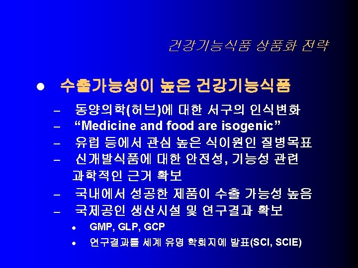 FDA proposed Rule for Dietary Supplement Current Good Manufacturing Practices (CGMPs) l Action 07 March, 2003 l Since 1993, received 7, 000 adverse report l Misbranding or Adulteration l Mandatory standards for Manufacturing or Labeling l Apply both domestic and foreign firms l 3 -year phase-in of a final rule for small businesses