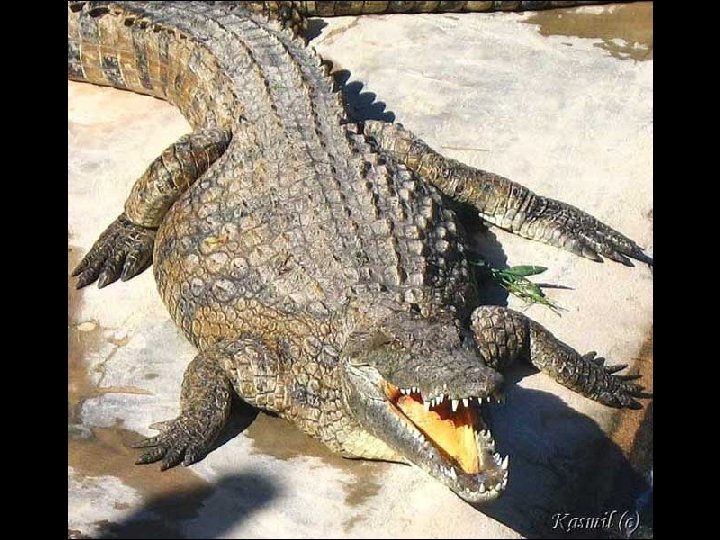 STIATI CA. . . �Crocodilii si aligatorii isi pot schimba dantura de peste patruzeci de ori. �in stomacul unui aligator s-au gasit trei bucati de lemn, un plumb de pescuit si o cutie de tutun. �Printre reptile, crocodilienii au cel mai complex creier �Gavialul de Gange indian este specia de crocodil care petrece cel mai mult timp in apa. Traieste in rauri cu apa bogata si cu un curs rapid. �Exemplarele din speciile mari de crocodili pot ramane sub apa peste o ora. in aceste situatii, urechea din exterior se inchide peste timpan.