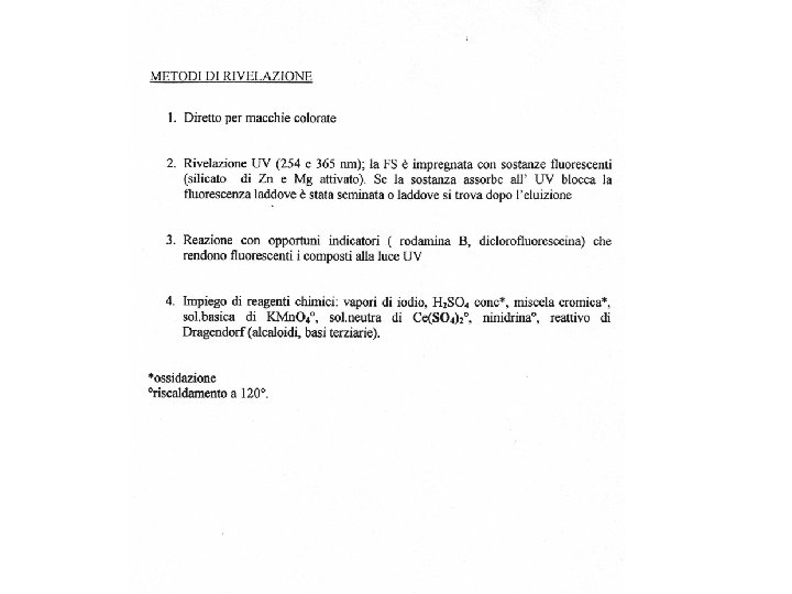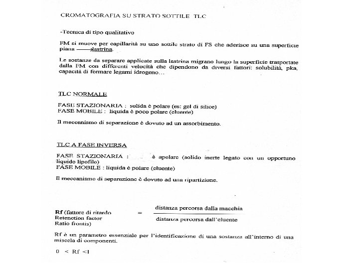 Fasi mobili: Serie elutropa Etere di petrolio Cicloesano Solfuro di carbonio / Benzene Diclorometano Cloroformio Etere etilico Tetraidrofurano Acetato di etile Acetone Aumento n-butanolo Etanolo Metanolo Acqua Ac. acetico glaciale Piridina Aumento della polarità del solvente Affinità per FS polari Acidi -COOH Alcoli -OH Ammine -NH 2 Mercaptani-SH Aldeidi -CHO Chetoni =C=O Esteri -COOR Eteri -OR Alcheni -CH=CHAlcani -R della forza di assorbimento
