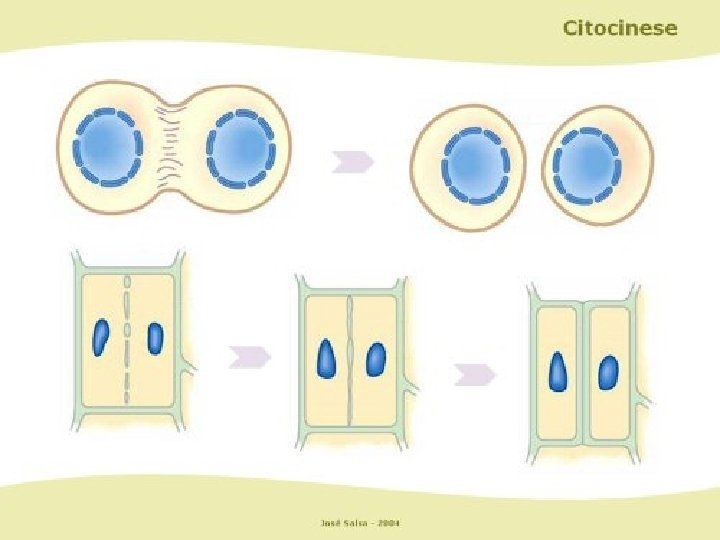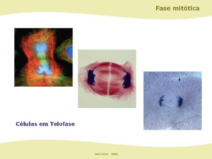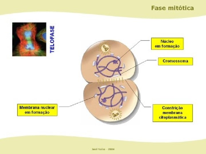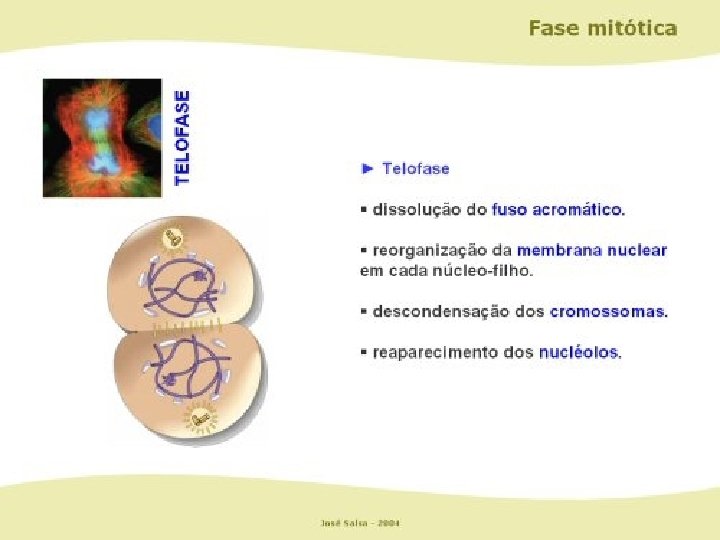 Meiose: Telófase I Os cromossomos descondensam-se parcialmente, e a carioteca se refaz em torno dos conjuntos cromossômicos. Divide-se o citoplasma (citocinese) e formam-se duas células haplóides, embora cada cromossomo tenha duas cromátides unidas pelo centrômero.