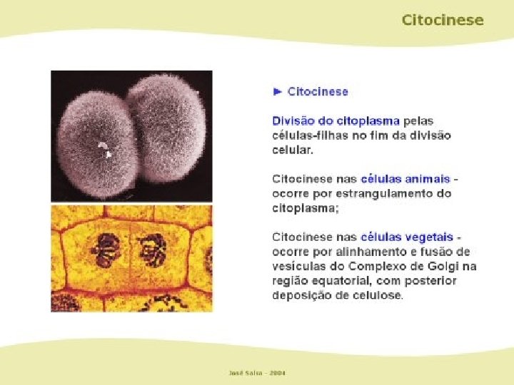 Meiose: Telófase II Em cada pólo, a carioteca se refaz em torno dos cromossomos, que se descondensam, e reaparecem os nucléolos. Desorganiza-se o fuso acromático. Ocorre a citocinese e originam-se 4 células haplóides e diferentes entre si.