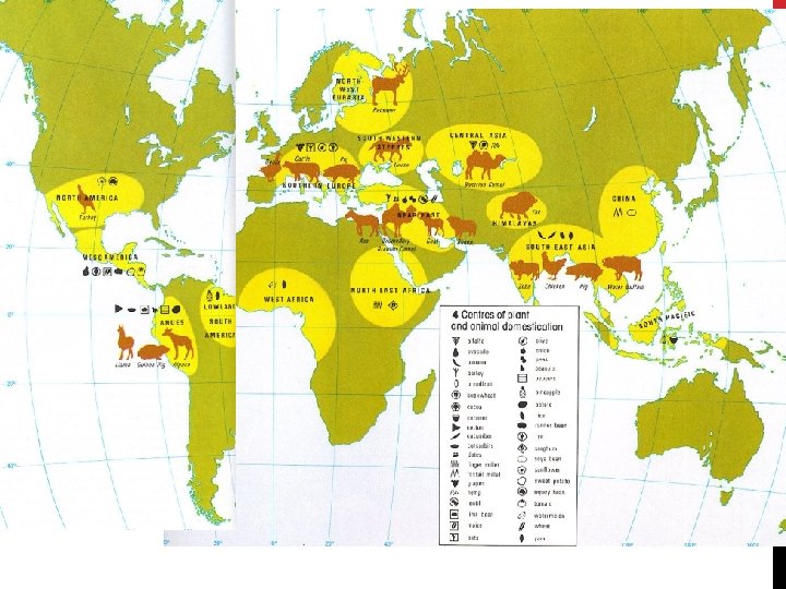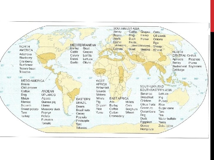 AGRICULTURAL ORIGINS-THE 1 ST AGRICULTURAL REVOLUTION * 1 st domestication of plants was in SE Asia - root crops-taro, yams & bananas 14, 000 yrs ago * Southwest Asia domesticated cereal crops - wheat, barley & oats-10, 000 yrs ago * Meso America- maize (corn), squash & beans * Africa-millet, sorghum, watermelons