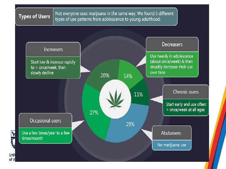 ALCOHOL USE 14 2005 82 16 20 2007 93 24 18 2009 96 30 15 2011 96 30 14 2013 33 0 20 40 60 80 Percent of Young Adults 96 100 Heavy Episodic Drinking (drank 5+ drinks more than once a week) Any Alcohol Use in the Past Year Felt the Need to Cut Down on Drinking