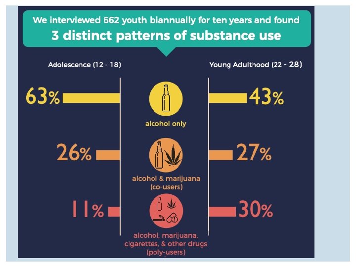 PARTICIPANTS INTERVIEWED ACROSS 10 YEARS Time 1 Time 2 Time 3 Time 4 Time 5 Time 6 2003 2005 2007 2009 2011 2013 • N = 539 (81%) • N = 459 (70%) N = 463 (70%) N = 477 (72%) • N = 662 • N = 578 (87%) 48% males 47% males 45% males 44% males 46% males 45% males 12 to 18 years 14 to 20 years 16 to 22 years 18 to 24 years 20 to 26 years 22 to 28 years
