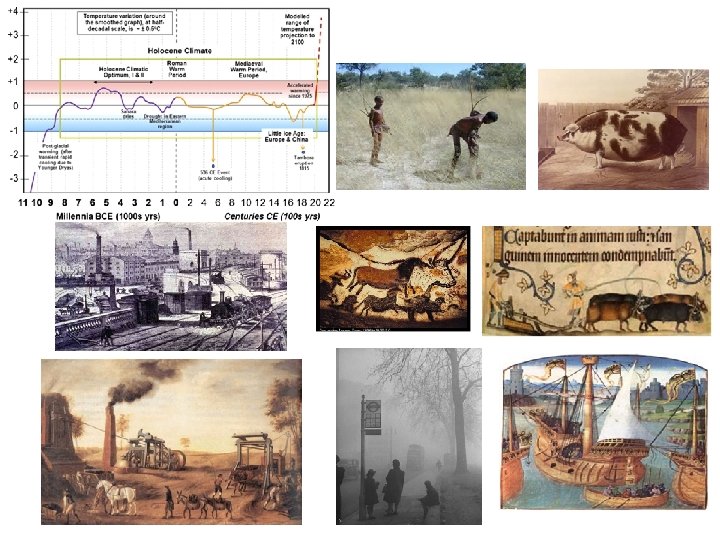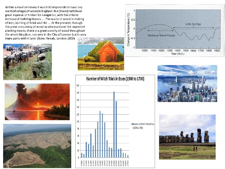 Start of agriculture (12, 000 years before present) Little Ice Age Medieval Warm Period The Big Freeze (Younger Dryas) Frost fairs and ice skating on the Thames Population growth (global population reaches 1 billion in c. 1800) Anthropocene (the period when humans have a significant impact on the global environment) Tambora volcanic eruption 1815 – the year without a summer Population growth (global population reaches 6 billion in 1999) The Romans grew wine in Britain Norse settlement of Greenland in the 10 th century More food Witch hunts (end of the 1500 s and throughout the 1600 s) Ford motors sold over a million cars in 1920 Selective breeding of livestock Swiss Alp villages destroyed by advancing glaciers Sources of energy Capitalism Factories Deforestation globally Famine Drought Migration Melting of the polar ice caps Great smog of London in 1952 Deforestation in England