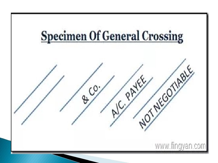 Two types of words in General Crossing 1. 2. Not Negotiable crossing – Clear indication to the banker that the bank has to be very careful while making payments on the cheque. Account Payee crossing – when a cheque is crossed “account payee only”, payment should be credited by the bank only to the account of the payee.