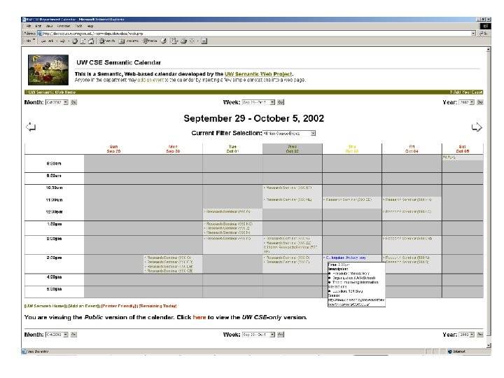 Darwin: an evolutionary approach to the semantic web Joint work with: Etzioni, Gribble, Levy, Mc. Dowell, Vlasseva n Two challenges: n n n Can we create conditions to entice people to create semantic content? Can a database evolve rather than being created in the traditional fashion? Goal: create a semantic web from data that is already on web pages: events, contact info, … n n Large number of very heterogeneous web pages. Wrapper technology does not apply. Accessing at query-time not scalable.