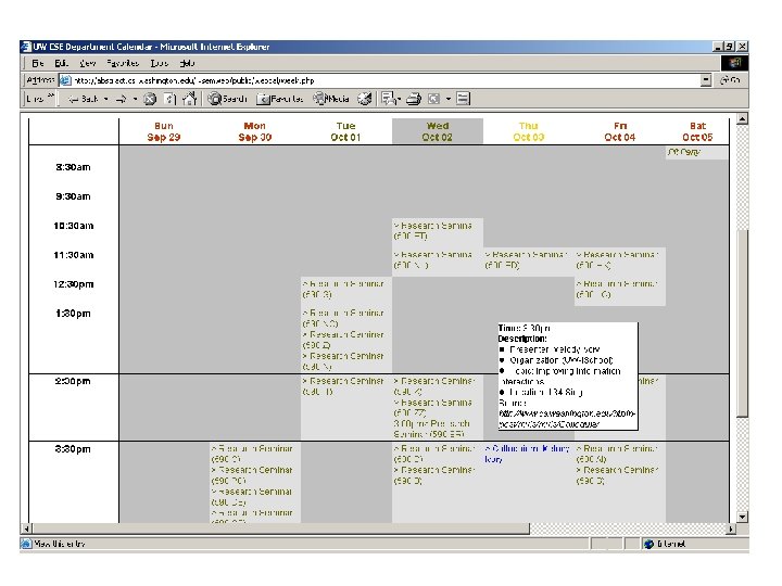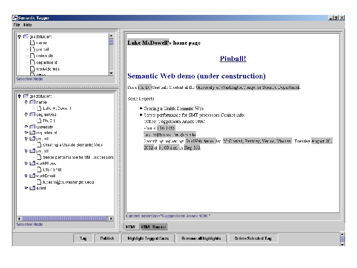 Crossing the Chasm w/ Revere n Key components: n n Darwin: Get people to structure their data. Piazza: Enable people to share their data. Statistics over structures: Import the main technique of the U-world into the S-world. Goal: create infrastructure for building semantic web applications: n First case study: creating a SW from data that is already on people’s web pages.