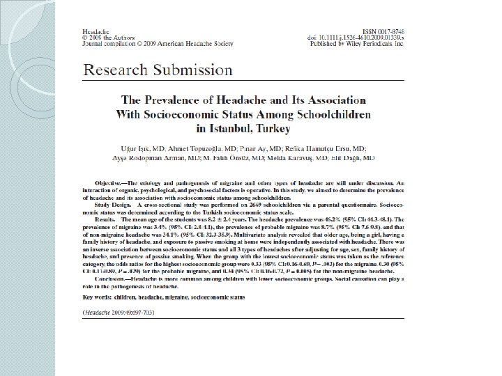 THE PREVALENCE OF HEADACHE AND ITS ASSOCIATION WITH SOCIOECONOMIC STATUS AMONG SCHOOLCHILDREN IN ISTANBUL, TURKEY