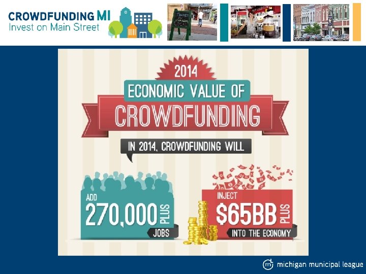 Why Crowdfunding is Important for Communities • • Economic and community development Local opportunity to diversify local economies Attract & retain talent Better Communities Better Michigan
