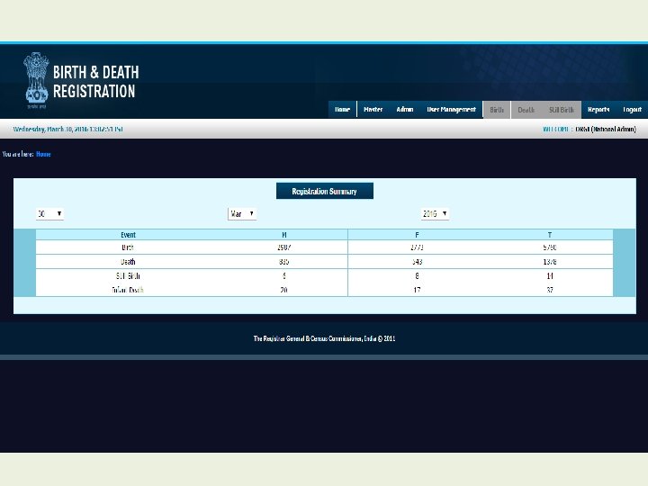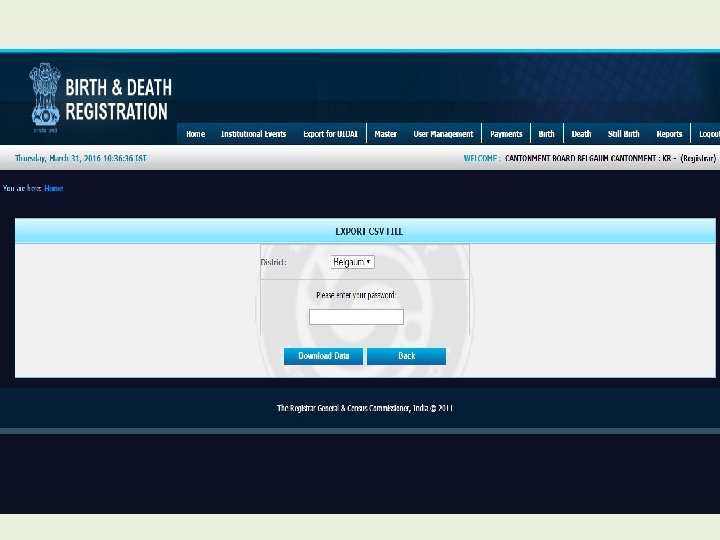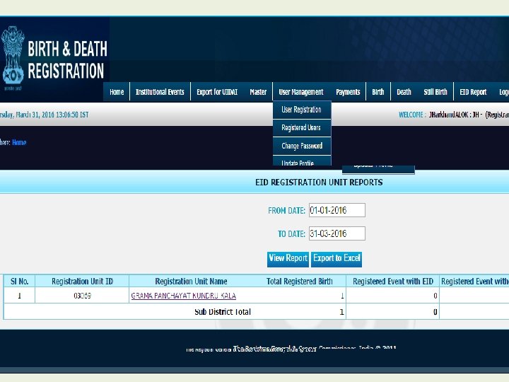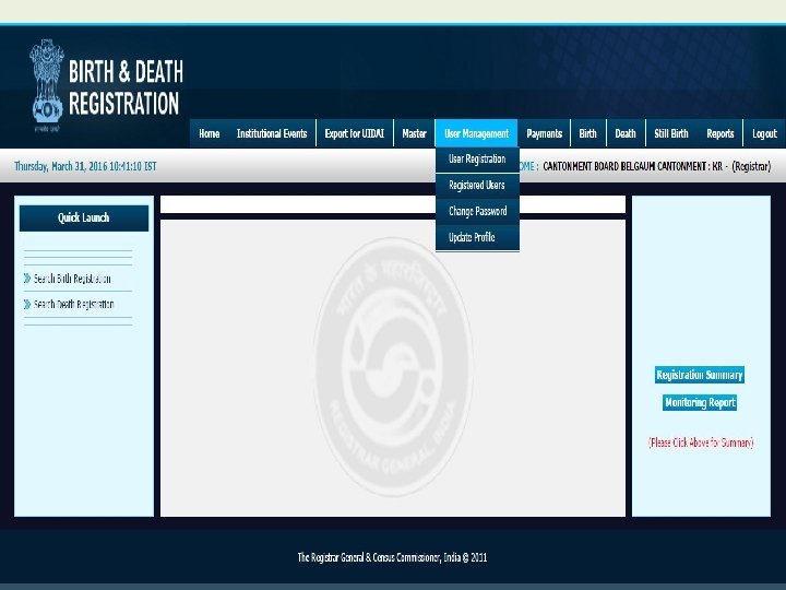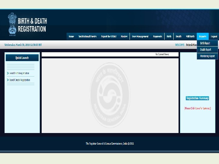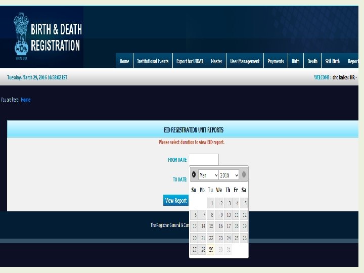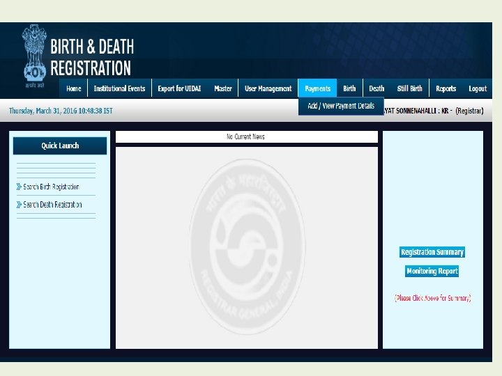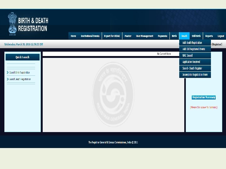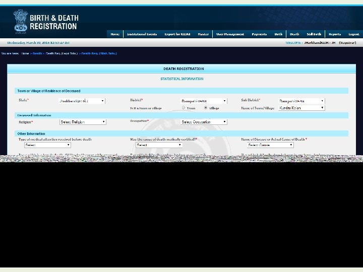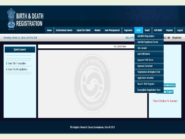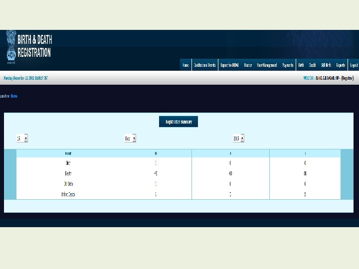 Modules for Registrar • • • Home Institutional Events Export for UIDAI Master User Management Payment Birth Death Still Birth Reports