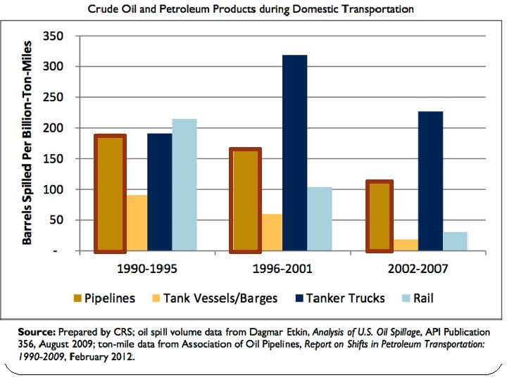 Are pipelines “safer”? Spill Risks of Pipelines v. Rail v. Vessel � Pipeline spills are inevitable (Forbes, April 2014). � Pipeline spills release much larger amounts of oil than spills from any other mode of transport. From 2004 to 2012, pipelines spilled three times the oil that oil trains did over the same period (PHMSA). � The 10 year average (2004 -2013) is 631 pipeline incidents per year with 97, 263 barrels (over 4 million gallons) per year spilled resulting in $494 million per year in property damage (PHMSA).