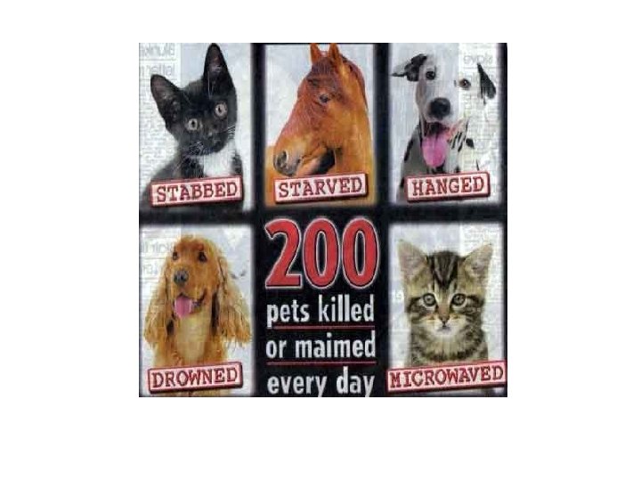 How to Recognize Animal Cruelty Environmental Signs • Pets are tied up alone outside for long periods of time without adequate food or water, or with food or water that is unsanitary • Pets are kept outside in inclement weather without access to adequate shelter • Pets are kept in an area littered with feces, garbage, broken glass or other objects that could harm them • Animals are housed in kennels or cages (very often crowded in with other animals) that are too small to allow them to stand, turn around and make normal movements possibly with too many other animals