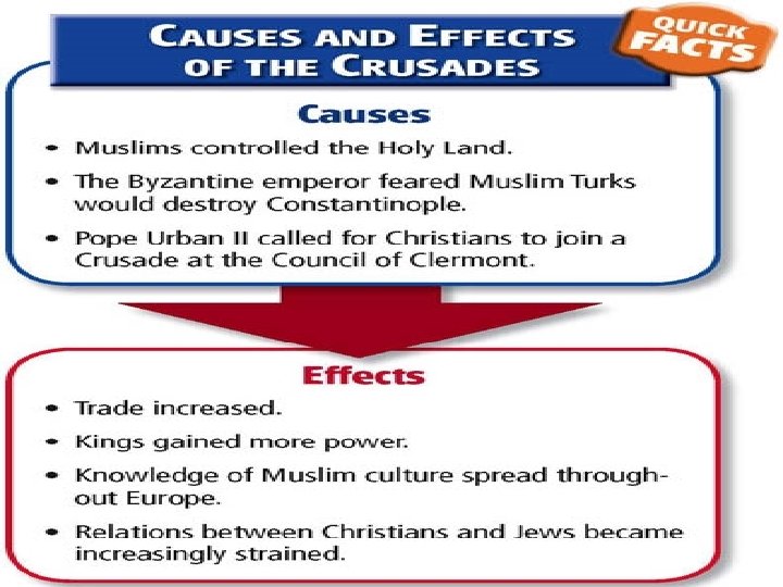 • • • Exposure to Muslim culture and to the world in general Feudal structure weakened Increased use of money Kept control of the Mediterranean Greek and Latin churches permanently split Failure of Crusades produced bitter feelings towards Muslims Effects