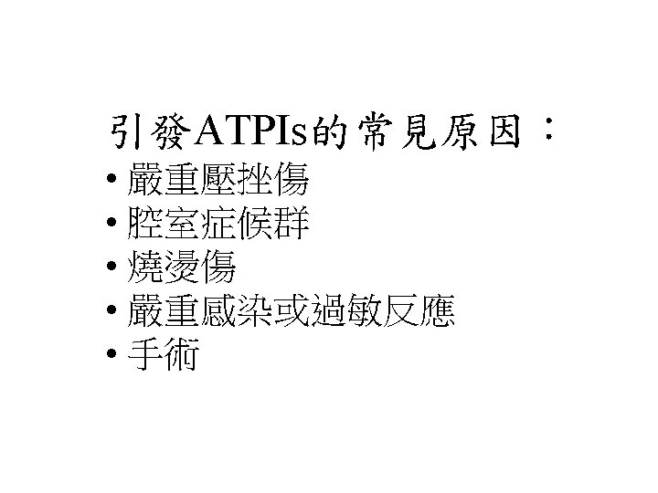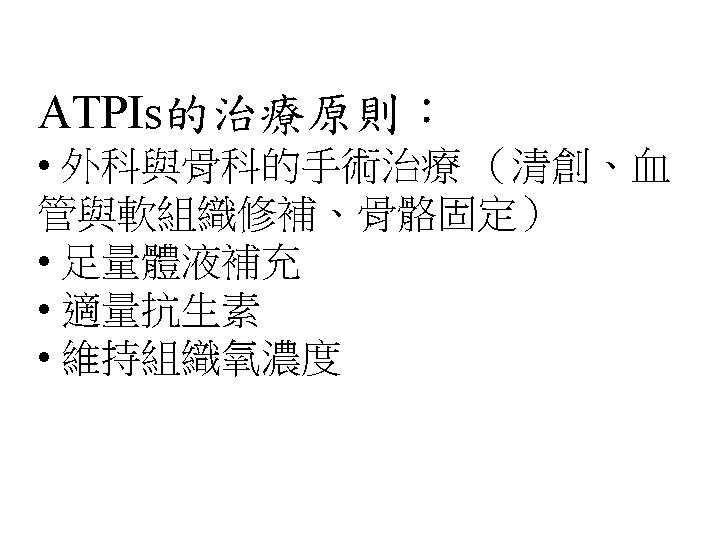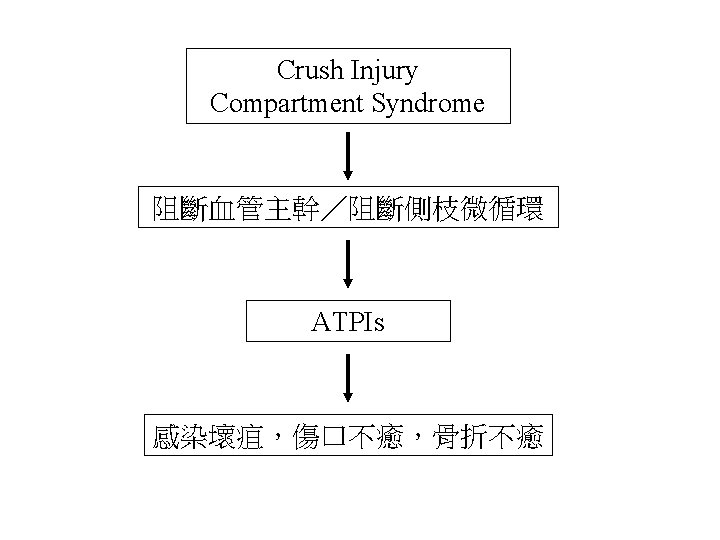 名詞說明 • Crush Injury 壓挫傷 • Compartment Syndrome 腔室症候群 • Acute Traumatic Ischemias (ATIs) 創傷型急性缺血 • Acute Traumatic Peripheral Ischemias (ATPIs) 創傷型急性四肢缺血