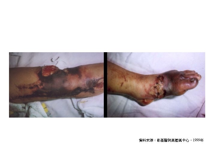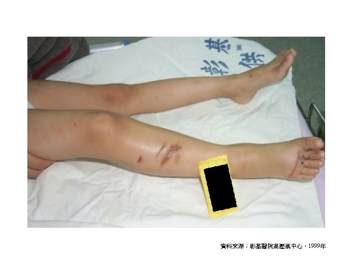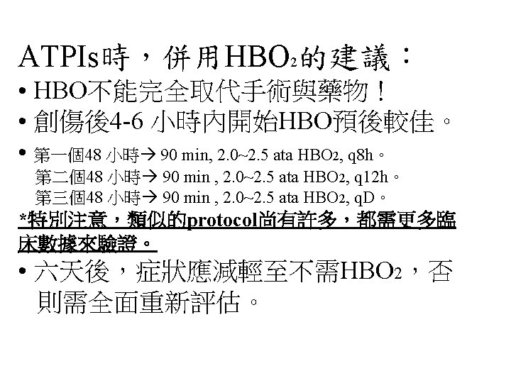 評估骨骼肌群 Compartment Syndrome I. 臨床症狀: 1. Severe pain in muscle compartment 2. Marked increase in pain with passive stretch of muscles in the compartment 3. Marked swelling of the compartment 4. Marked tenseness of the muscle compartment 5. Neuropathy, myelopathy, and/or encephalopathy II. 骨骼肌腔室壓力測量: 1. Greater than 40 mm. Hg in the uncomprotnised host 2. Rising serial compartment pressure measurements as values approach 35 mm. Hg 3. 30 -40 mm. Hg in mildly compromised host (diabetic, peripheral vascular disease, collagen vascular disease, etc. ) 4. 20 -30 mm. Hg in hypotensive patients where systolic blood pressure is 33 to 50% lower than is expected. 下二項任一時建議輔以HBO 2: • 在 I. 臨床症狀 內有3項以上。 • 在 II. 骨骼肌腔室壓力測量 內有任何一項。