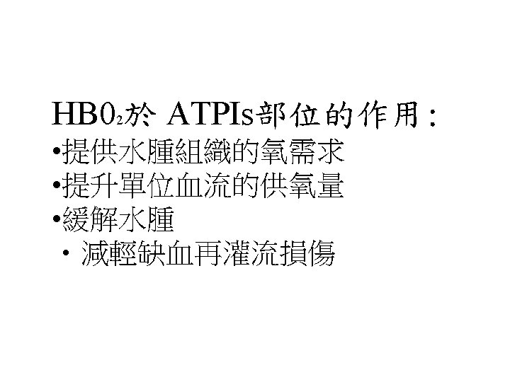 四肢 Crush Injuries何時輔以 HBO 2 ? ~ 用 Mangled Extremity Severity Score (MESS) 來評估 A. Skeletal/soft tissue injury Low energy (stab, simple fracture; low velocity gun shot wound) Medium energy (open or multiple fractures, dislocations) High energy (close-range shot gun or high velocity GSW, crush injury) Very high energy (above plus gross contamination, soft tissue avulsion) Points 1 2 3 4 B. Limb ischemia Pulse reduced or absent, but perfusion present Pulselessness, paresthesias, diminished capillary refill 2* Cool, paralyzed, insensate, numb 3* *Double score if ischemia time > 6 hours 1* 2* 3* C. Shock Systolic BP always > 90 mm. Hg Hypotension transiently Persistent hypotension 0 1 2 D. Age < 30 30 -50 > 50 0 1 2 • MESS=A+B+C+D • Johansen et al 建議當 MESS 7 分以上時應行截肢。 • MESS 在 3~8分時,依以下原則決定HBO 2輔助治療。 MESS (甲) 7 (possibly 8) (乙) 5, 6 (丙) 3, 4 HB 02 Indications (甲) 分數主要來自B, C, D三項的健常患者。 (乙) 糖尿病、周邊動脈硬化、凝血或膠原蛋白功能異常、、、等不 良癒傷因子,輕或中度者。 (丙)糖尿病、周邊動脈硬化、凝血或膠原蛋白功能異常、、、等不良 癒傷因子,重度者。