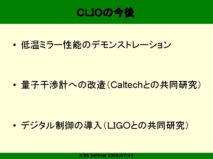 SUMMARY Cryogenic prototype CLIO is in commissioning phase. Cryogenic interferometer is feasible. But we have to improve some points, especially, the combination of heat transfer and vibration isolation is important. ICRR Seminar 2009/07/24