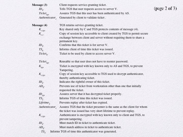 Kerberos • Authentication service developed as part of Project Athena at MIT • A workstation cannot be trusted to identify its users correctly to network services • A user may gain access to a particular workstation and pretend to be another user operating from that workstation • A user may alter the network address of a workstation so that the requests sent from the altered workstation appear to come from the impersonated workstation • A user may eavesdrop on exchanges and use a