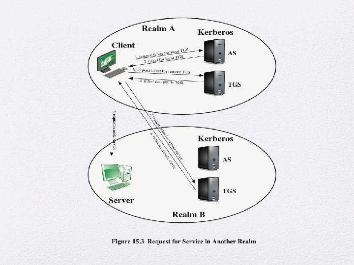 Kerberos Realms and Multiple Kerberi • A full-service Kerberos environment consisting of a Kerberos server, a number of clients, and a number of application servers requires that: • The Kerberos server must have the user ID and hashed passwords of all participating users in its database; all users are registered with the Kerberos server • The Kerberos server must share a secret key with each server; all servers are registered with the Kerberos server • The Kerberos server in each interoperating realm shares a secret key with the server in the other