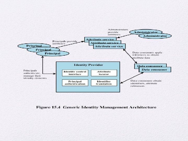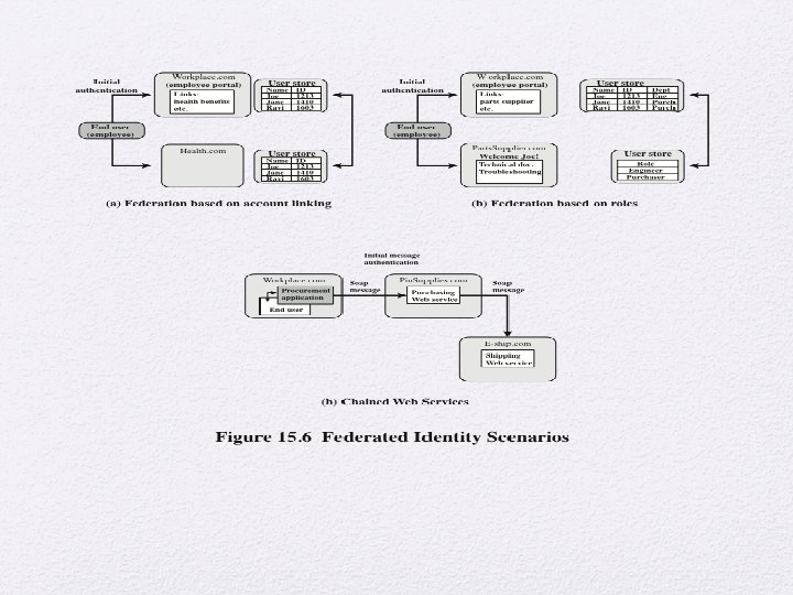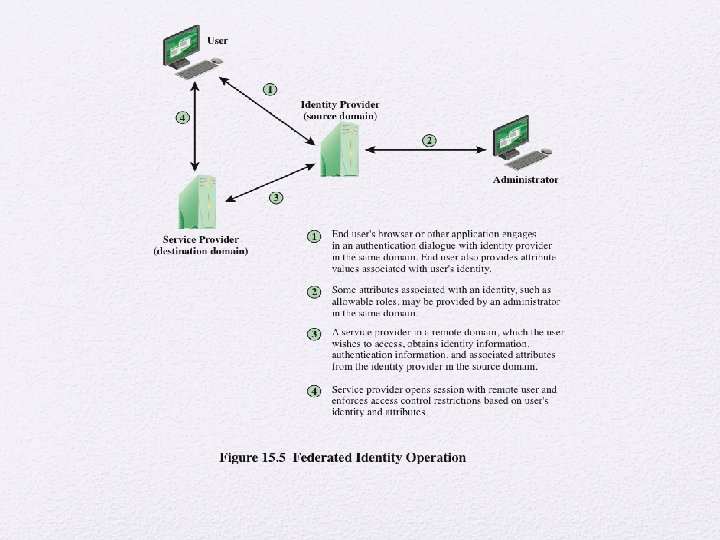Federated Identity Management • Relatively new concept dealing with the use of a common identity management scheme across multiple enterprise and numerous applications and supporting many users • Services provided include: • Point of contact • SSO protocol services • Trust services • Key services • Identity services • Authorization • Provisioning