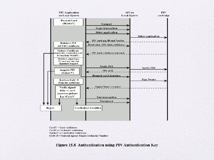 Authentication • Using the electronic credentials resident on a PIV card, the card supports the following authentication mechanisms: • CHUID • The cardholder is authenticated using the signed CHUID data element on the card. The PIN is not required. This mechanism is useful in environments where a low level of assurance is acceptable and rapid contactless authentication is necessary • Card Authentication Key • The PIV card is authenticated using the Card Authentication Key in a challenge response protocol. The PIN is not required. This mechanism allows contact (via card reader) or contactless (via radio waves) authentication of the PIV card without the holder’s active participation, and provides a low level of assurance • BIO The cardholder is authenticated by matching his or her fingerprint sample(s) to the signed biometric data element in an environment without a human attendant in view. The PIN is required to activate the card. This mechanism achieves a high level of assurance and requires the cardholder’s active participation is submitting the PIN as well as the biometric sample • BIO-A The cardholder is authenticated by matching his or her fingerprint sample(s) to the signed biometric data element in an environment with a human attendant in view. The PIN is required to activate the card. This mechanism achieves a very high level of assurance when coupled with full trust validation of the biometric template retrieved from the card, and requires the cardholder’s active participation is submitting the PIN as well as the biometric sample • PKI The cardholder is authenticated by demonstrating control of the PIV authentication private key in a challenge response protocol that can be validated using the PIV authentication certificate. The PIN is required to activate the card. This mechanism achieves a very high level of identity assurance and requires the cardholder’s knowledge of the PIN