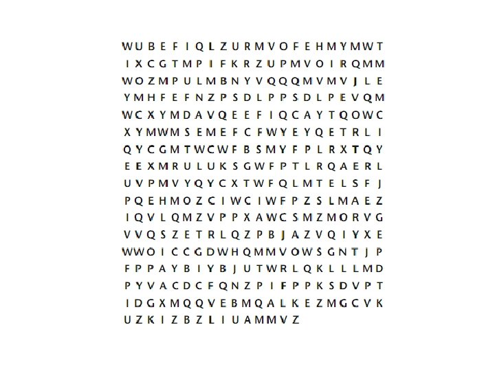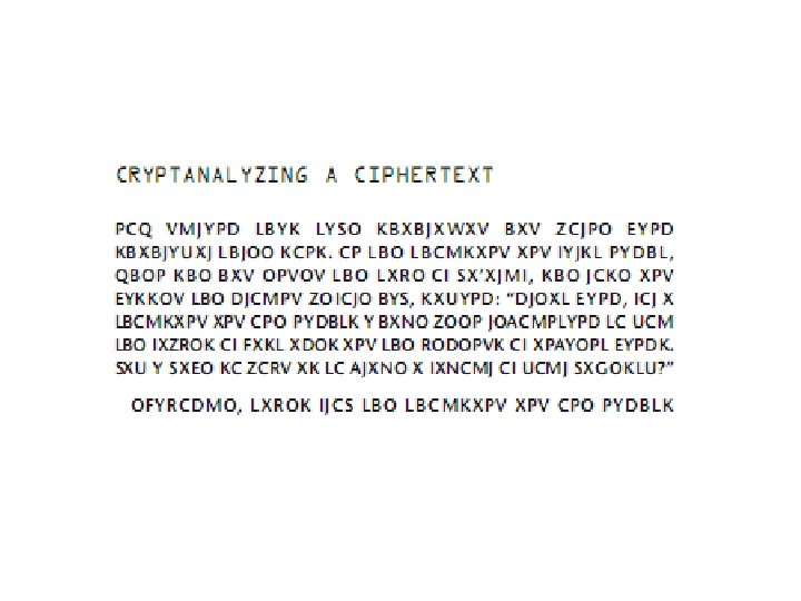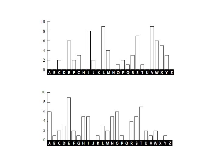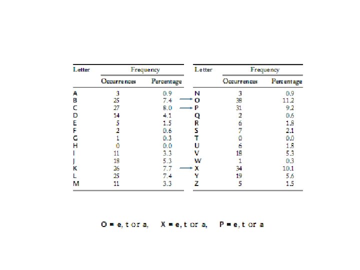 • Combination OO appears twice, whereas XX does not appear at all. • X and Y appear on their own in the ciphertext. (a and I are the only English word that consisit of a single letter) • In the English language, the letter h frequently goes before the letter e (as in the, then, they, etc. ), but rarely after e. h