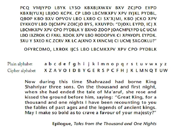 • Every word has a vowel in it, so C in Cn is a vowel. The only vowels remaining are o and u. u does not fit so C = o. • We also have the word Khe, which implies that K represents either t or s. But we already know that L = t, so it becomes clear that K = s. • tho. Msand one ni. Dhts thousand one nights