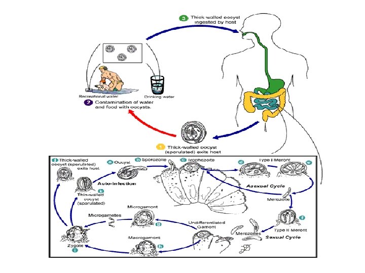 Life Cycle • Complex monoxenous life cycle--completing its entire cycle within a single host with both sexual and asexual cycles, and there are six distinct developmental stages • Excystation of the orally ingested oocyst in the small bowel with release of the four sporozoites • Invasion of intestinal epithelial cells initiation of the asexual intracellular multiplication stage • Differentiation of microgametes and macrogametes • Fertilization initiating sexual replication & Development of oocysts • The formation of new, infectious sporozoites within the oocyst, which is then excreted in the stool