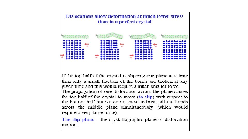 BOND BREAKING AND REMAKING • Dislocation motion requires the successive bumping of a half plane of atoms (from left to right here). • Bonds across the slipping planes are broken and remade in succession. Atomic view of edge dislocation motion from left to right as a crystal is sheared. (Courtesy P. M. Anderson)