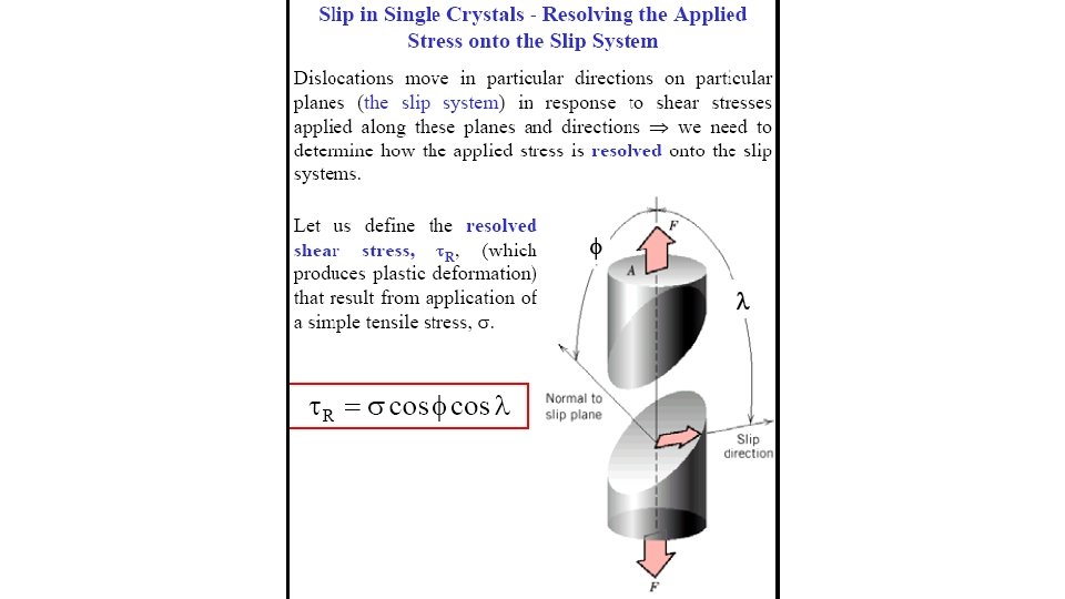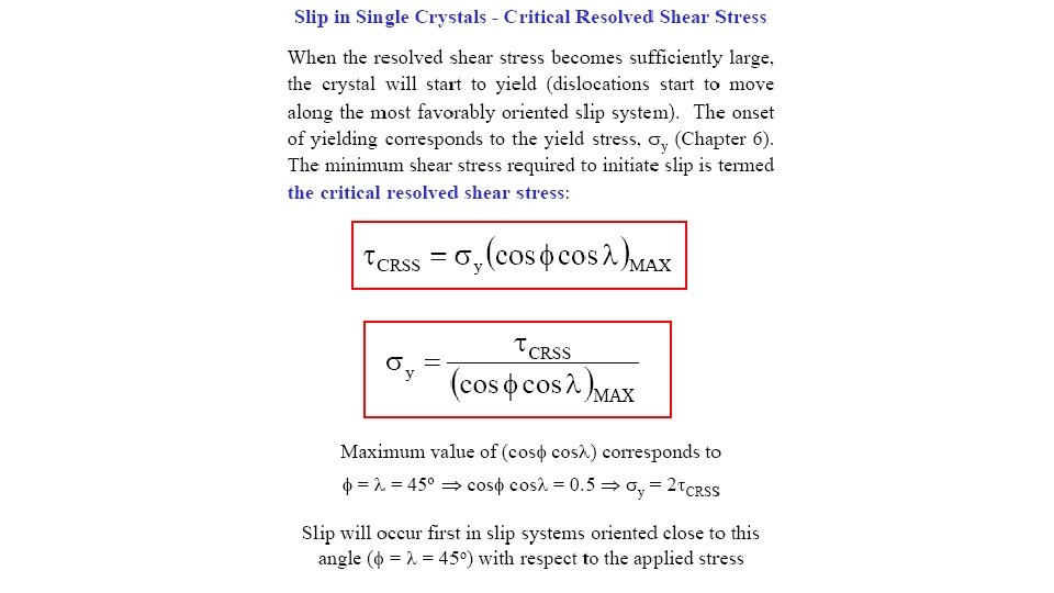 CRITICAL RESOLVED SHEAR STRESS • Condition for dislocation motion: • Crystal orientation can make it easy or hard to move disl.